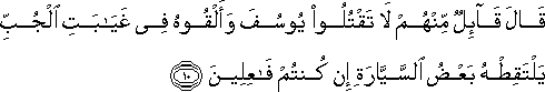 | 12.10 | One among them said: Kill not Joseph but, if ye must be doing, fling him into the depth of the pit; some caravan will find him. | Qāla Qā'ilun Minhum Lā Taqtulū Yūsufa Wa 'Alqūhu Fī Ghayābati Al-Jubbi Yaltaqiţhu Ba`đu As-Sayyārati 'In Kuntum Fā`ilīna |