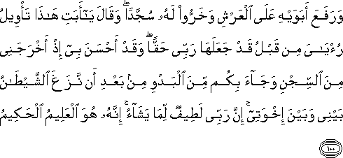 | 12.100 | And he placed his parents on the dais and they fell down before him prostrate, and he said: O my father! This is the interpretation of my dream of old. My Lord hath made it true, and He hath shown me kindness, since He took me out of the prison and hath brought you from the desert after Satan had made strife between me and my brethren. Lo! my Lord is tender unto whom He will. He is the Knower, the Wise. | Wa Rafa`a 'Abawayhi `Alá Al-`Arshi Wa Kharrū Lahu Sujjadāan Wa Qāla Yā 'Abati Hādhā Ta'wīlu Ru'uyā Y Min Qablu Qad Ja`alahā Rabbī Ĥaqqāan Wa Qad 'Aĥsana Bī 'Idh 'Akhrajanī Mina As-Sijni Wa Jā'a Bikum Mina Al-Badwi Min Ba`di 'An Nazagha Ash-Shayţānu Baynī Wa Bayna 'Ikhwatī 'Inna Rabbī Laţīfun Limā Yashā'u 'Innahu Huwa Al-`Alīmu Al-Ĥakīmu |