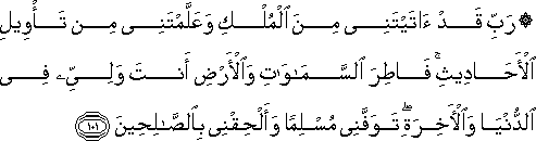 | 12.101 | O my Lord! Thou hast given me (something) of sovereignty and hast taught me (something) of the interpretation of events - Creator of the heavens and the earth! Thou art my Protecting Guardian in the world and the Hereafter. Make me to die muslim (unto Thee), and join me to the righteous. | Rabbi Qad 'Ātaytanī Mina Al-Mulki Wa `Allamtanī Min Ta'wīli Al-'Aĥādīthi Fāţira As-Samāwāti Wa Al-'Arđi 'Anta Wa Līyi Fī Ad-Dunyā Wa Al-'Ākhirati Tawaffanī Muslimāan Wa 'Alĥiqnī Biş-Şāliĥīna |