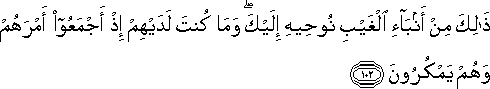 | 12.102 | This is of the tidings of the Unseen which We inspire in thee (Muhammad). Thou wast not present with them when they fixed their plan and they were scheming. | Dhālika Min 'Anbā'i Al-Ghaybi Nūĥīhi 'Ilayka Wa Mā Kunta Ladayhim 'Idh 'Ajma`ū 'Amrahum Wa Hum Yamkurūna |