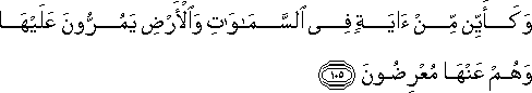 | 12.105 | How many a portent is there in the heavens and the earth which they pass by with face averted! | Wa Ka'ayyin Min 'Āyatin Fī As-Samāwāti Wa Al-'Arđi Yamurrūna `Alayhā Wa Hum `Anhā Mu`riđūna |