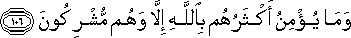 | 12.106 | And most of them believe not in Allah except that they attribute partners (unto Him). | Wa Mā Yu'uminu 'Aktharuhum Billāhi 'Illā Wa Hum Mushrikūna |