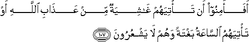 | 12.107 | Deem they themselves secure from the coming on them of a pall of Allahīs punishment, or the coming of the Hour suddenly while they are unaware? | 'Afa'aminū 'An Ta'tiyahum Ghāshiyatun Min `Adhābi Allāhi 'Aw Ta'tiyahumu As-Sā`atu Baghtatan Wa Hum Lā Yash`urūna |