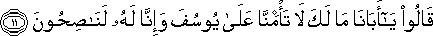 | 12.11 | They said: O our father! Why wilt thou not trust us with Joseph, when lo! we are good friends to him? | Qālū Yā 'Abānā Mā Laka Lā Ta'mannā `Alá Yūsufa Wa 'Innā Lahu Lanāşiĥūna |