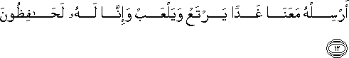| 12.12 | Send him with us to-morrow that he may enjoy himself and play. And lo! we shall take good care of him. | 'Arsilhu Ma`anā Ghadāan Yarta` Wa Yal`ab Wa 'Innā Lahu Laĥāfiūna |