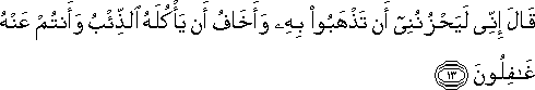 | 12.13 | He said: Lo! in truth it saddens me that ye should take him with you, and I fear less the wolf devour him while ye are heedless of him. | Qāla 'Innī Layaĥzununī 'An Tadh/habū Bihi Wa 'Akhāfu 'An Ya'kulahu Adh-Dhi'bu Wa 'Antum `Anhu Ghāfilūna |