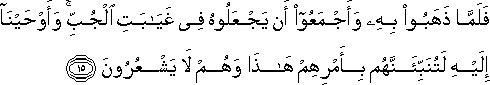 | 12.15 | Then, when they led him off, and were of one mind that they should place him in the depth of the pit, We inspired in him: Thou wilt tell them of this deed of theirs when they know (thee) not. | Falammā Dhahabū Bihi Wa 'Ajma`ū 'An Yaj`alūhu Fī Ghayābati Al-Jubbi Wa 'Awĥaynā 'Ilayhi Latunabbi'annahum Bi'amrihim Hādhā Wa Hum Lā Yash`urūna |