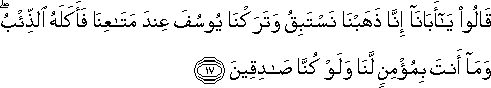 | 12.17 | Saying: O our father! We went racing one with another, and left Joseph by our things, and the wolf devoured him, and thou believest not our saying even when we speak the truth. | Qālū Yā 'Abānā 'Innā Dhahabnā Nastabiqu Wa Taraknā Yūsufa `Inda Matā`inā Fa'akalahu Adh-Dhi'bu Wa Mā 'Anta Bimu'uminin Lanā Wa Law Kunnā Şādiqīna |