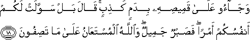 | 12.18 | And they came with false blood on his shirt. He said: Nay, but your minds have beguiled you into something. (My course is) comely patience. And Allah it is Whose help is to be sought in that (predicament) which ye describe. | Wa Jā'ū `Alá Qamīşihi Bidamin Kadhibin Qāla Bal Sawwalat Lakum 'Anfusukum 'Amrāan Faşabrun Jamīlun Wa Allāhu Al-Musta`ānu `Alá Mā Taşifūna |