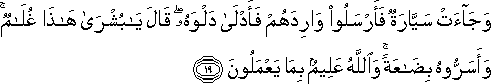 | 12.19 | And there came a caravan, and they sent their waterdrawer. He let down his pail (into the pit). He said: Good luck! Here is a youth. And they hid him as a treasure, and Allah was Aware of what they did. | Wa Jā'at Sayyāratun Fa'arsalū Wa Aridahum Fa'adlá Dalwahu Qāla Yā Bushrá Hādhā Ghulāmun Wa 'Asarrūhu Biđā`atan Wa Allāhu `Alīmun Bimā Ya`malūna |