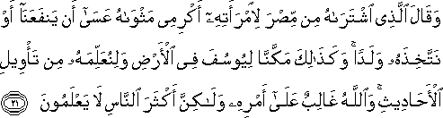 | 12.21 | And he of Egypt who purchased him said unto his wife: Receive him honourably. Perchance he may prove useful to us or we may adopt him as a son. Thus we established Joseph in the land that We might teach him the interpretation of events. And Allah was predominant in His career, but most of mankind know not. | Wa Qāla Al-Ladhī Ashtarāhu Min Mişra Li'imra'atihi 'Akrimī Mathwāhu `Asá 'An Yanfa`anā 'Aw Nattakhidhahu Waladāan Wa Kadhalika Makkannā Liyūsufa Fī Al-'Arđi Wa Linu`allimahu Min Ta'wīli Al-'Aĥādīthi Wa Allāhu Ghālibun `Alá 'Amrihi Wa Lakinna 'Akthara An-Nāsi Lā Ya`lamūna |