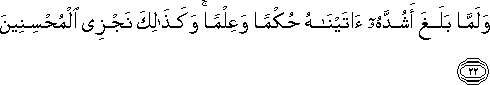 | 12.22 | And And when he reached his prime We gave him wisdom and knowledge. Thus We reward the good. | Wa Lammā Balagha 'Ashuddahu 'Ātaynāhu Ĥukmāan Wa `Ilmāan Wa Kadhalika Najzī Al-Muĥsinīna |