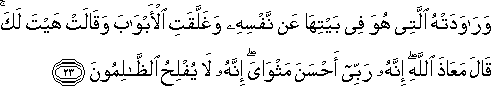 | 12.23 | And she, in whose house he was, asked of him an evil act. She bolted the doors and said: Come! He said: I seek refuge in Allah! Lo! he is my lord, who hath treated me honourably. Lo! wrong-doers never prosper. | Wa Rāwadat/hu Allatī Huwa Fī Baytihā `An Nafsihi Wa Ghallaqati Al-'Abwāba Wa Qālat Hayta Laka Qāla Ma`ādha Allāhi 'Innahu Rabbī 'Aĥsana Mathwāya 'Innahu Lā Yufliĥu A-ālimūna |