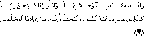 | 12.24 | She verily desired him, and he would have desired her if it had not been that he saw the argument of his Lord. Thus it was, that We might ward off from him evil and lewdness. Lo! he was of Our chosen slaves. | Wa Laqad Hammat Bihi Wa Hamma Bihā Lawlā 'An Ra'á Burhāna Rabbihi Kadhālika Linaşrifa `Anhu As-Sū'a Wa Al-Faĥshā'a 'Innahu Min `Ibādinā Al-Mukhlaşīna |