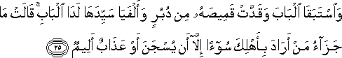 | 12.25 | And they raced with one another to the door, and she tore his shirt from behind, and they met her lord and master at the door. She said: What shall be his reward, who wisheth evil to thy folk, save prison or a painful doom? | Wa Astabaqā Al-Bāba Wa Qaddat Qamīşahu Min Duburin Wa 'Alfayā Sayyidahā Ladá Al-Bābi Qālat Mā Jazā'u Man 'Arāda Bi'ahlika Sū'āan 'Illā 'An Yusjana 'Aw `Adhābun 'Alīmun |