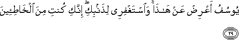 | 12.29 | O Joseph! Turn away from this, and thou, (O woman), ask forgiveness for thy sin. Lo! thou art of the faulty. | Yūsufu 'A`riđ `An Hādhā Wa Astaghfirī Lidhanbiki 'Innaki Kunti Mina Al-Khāţi'īna |