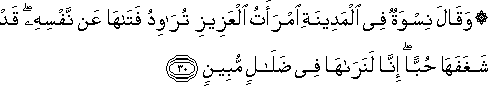 | 12.30 | And women in the city said: The rulerīs wife is asking of her slave-boy an ill-deed. Indeed he has smitten her to the heart with love. We behold her in plain aberration. | Wa Qāla Niswatun Fī Al-Madīnati Amra'atu Al-`Azīzi Turāwidu Fatāhā `An Nafsihi Qad Shaghafahā Ĥubbāan 'Innā Lanarāhā Fī Đalālin Mubīnin |