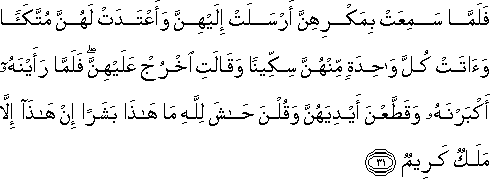 | 12.31 | And when she heard of their sly talk, she sent to them and prepared for them a cushioned couch (to lie on at the feast) and gave to every one of them a knife and said (to Joseph): Come out unto them! And when they saw him they exalted him and cut their hands, exclaiming: Allah Blameless! This is no a human being. This is not other than some gracious angel. | Falammā Sami`at Bimakrihinna 'Arsalat 'Ilayhinna Wa 'A`tadat Lahunna Muttaka'an Wa 'Ātat Kulla Wāĥidatin Minhunna Sikkīnāan Wa Qālati Akhruj `Alayhinna Falammā Ra'aynahu 'Akbarnahu Wa Qaţţa`na 'Aydiyahunna Wa Qulna Ĥāsha Lillāhi Mā Hādhā Basharāan 'In Hādhā 'Illā Malakun Karīmun |