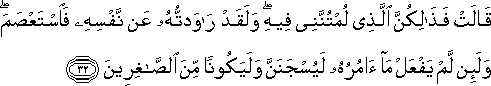 | 12.32 | She said: This is he on whose account ye blamed me. I asked of him an evil act, but he proved continent, but if he do not my behest he verily shall be imprisoned, and verily shall be of those brought low. | Qālat Fadhālikunna Al-Ladhī Lumtunnanī Fīhi Wa Laqad Rāwadttuhu `An Nafsihi Fāsta`şama Wa La'in Lam Yaf`al Mā 'Āmuruhu Layusjananna Wa Layakūnāan Mina Aş-Şāghirīna |