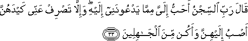 | 12.33 | He said: O my Lord! Prison is more dear than that unto which they urge me, and if Thou fend not off their wiles from me I shall incline unto them and become of the foolish. | Qāla Rabbi As-Sijnu 'Aĥabbu 'Ilayya Mimmā Yad`ūnanī 'Ilayhi Wa 'Illā Taşrif `Annī Kaydahunna 'Aşbu 'Ilayhinna Wa 'Akun Mina Al-Jāhilīna |