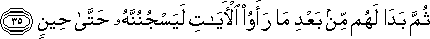 | 12.35 | And it seemed good to them (the men-folk) after they had seen the signs (of his innocence) to imprison him for a time. | Thumma Badā Lahum Min Ba`di Mā Ra'aw Al-'Āyāti Layasjununnahu Ĥattá Ĥīnin |