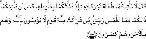 | 12.37 | He said: The food which ye are given (daily) shall not come unto you but I shall tell you the interpretation ere it cometh unto you. This is of that which my Lord hath taught me. Lo! I have forsaken the religion of folk who believe not in Allah and are disbelievers in the Hereafter. | Qāla Lā Ya'tīkumā Ţa`āmun Turzaqānihi 'Illā Nabba'tukumā Bita'wīlihi Qabla 'An Ya'tiyakumā Dhālikumā Mimmā `Allamanī Rabbī 'Innī Taraktu Millata Qawmin Lā Yu'uminūna Billāhi Wa Hum Bil-'Ākhirati Hum Kāfirūna |