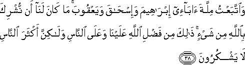 | 12.38 | And I have followed the religion of my fathers, Abraham and Isaac and Jacob. It never was for us to attribute aught as partner to Allah. This is of the bounty of Allah unto us (the seed of Abraham) and unto mankind; but most men give not thanks. | Wa Attaba`tu Millata 'Ābā'ī 'Ibrāhīma Wa 'Isĥāqa Wa Ya`qūba Mā Kāna Lanā 'An Nushrika Billāhi Min Shay'in Dhālika Min Fađli Allāhi `Alaynā Wa `Alá An-Nāsi Wa Lakinna 'Akthara An-Nāsi Lā Yashkurūna |