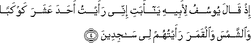 | 12.4 | When Joseph said unto his father: O my father! Lo! I saw in a dream eleven planets and the sun and the moon, I saw them prostrating themselves unto me. | 'Idh Qāla Yūsufu Li'abīhi Yā 'Abati 'Innī Ra'aytu 'Aĥada `Ashara Kawkabāan Wa Ash-Shamsa Wa Al-Qamara Ra'aytuhum Lī Sājidīna |