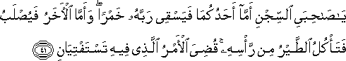 | 12.41 | O my two fellow-prisoners! As for one of you, he will pour out wine for his lord to drink; and as for the other, he will be crucified so that the birds will eat from his head. Thus is the case judged concerning which ye did inquire. | Yā Şāĥibayi As-Sijni 'Ammā 'Aĥadukumā Fayasqī Rabbahu Khamrāan Wa 'Ammā Al-'Ākharu Fayuşlabu Fata'kulu Aţ-Ţayru Min Ra'sihi Quđiya Al-'Amru Al-Ladhī Fīhi Tastaftiyāni |