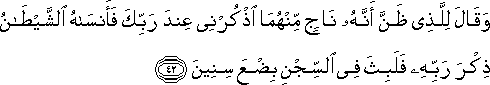 | 12.42 | And he said unto him of the twain who he knew would be released: Mention me in the presence of thy lord. But Satan caused him to forget to mention it to his lord, so he (Joseph) stayed in prison for some years. | Wa Qāla Lilladhī anna 'Annahu Nājin Minhumā Adhkurnī `Inda Rabbika Fa'ansāhu Ash-Shayţānu Dhikra Rabbihi Falabitha Fī As-Sijni Biđ`a Sinīna |