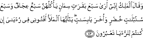 | 12.43 | And the king said: Lo! I saw in a dream seven fat kine which seven lean were eating, and seven green ears of corn and other (seven) dry. O notables! Expound for me my vision, if ye can interpret dreams. | Wa Qāla Al-Maliku 'Innī 'Ará Sab`a Baqarātin Simānin Ya'kuluhunna Sab`un `Ijāfun Wa Sab`a Sunbulātin Khuđrin Wa 'Ukhara Yā Bisātin Yā 'Ayyuhā Al-Mala'u 'Aftūnī Fī Ru'uyā Ya 'In Kuntum Lilrru'uyā Ta`burūna |