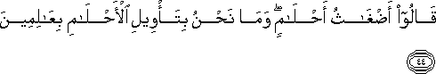 | 12.44 | They answered: Jumbled dreams! And we are not knowing in the interpretation of dreams. | Qālū 'Ađghāthu 'Aĥlāmin Wa Mā Naĥnu Bita'wīli Al-'Aĥlāmi Bi`ālimīna |