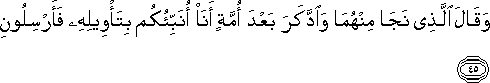 | 12.45 | And he of the two who was released, and (now) at length remembered, said: I am going to announce unto you the interpretation, therefore send me forth. | Wa Qāla Al-Ladhī Najā Minhumā Wa Aiddakara Ba`da 'Ummatin 'Anā 'Unabbi'ukum Bita'wīlihi Fa'arsilūni |