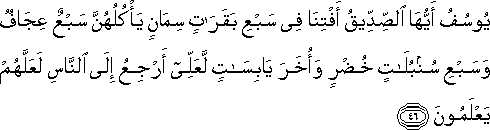 | 12.46 | (And when he came to Joseph in the prison, he exclaimed): Joseph! O thou truthful one! Expound for us the seven fat kine which seven lean were eating and the seven green ears of corn and other (seven) dry, that I may return unto the people, so that they may know. | Yūsufu 'Ayyuhā Aş-Şiddīqu 'Aftinā Fī Sab`i Baqarātin Simānin Ya'kuluhunna Sab`un `Ijāfun Wa Sab`i Sunbulātin Khuđrin Wa 'Ukhara Yā Bisātin La`allī 'Arji`u 'Ilá An-Nāsi La`allahum Ya`lamūna |