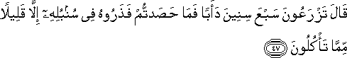 | 12.47 | He said: Ye shall sow seven years as usual, but that which ye reap, leave it in the ear, all save a little which ye eat. | Qāla Tazra`ūna Sab`a Sinīna Da'abāan Famā Ĥaşadtum Fadharūhu Fī Sunbulihi 'Illā Qalīlāan Mimmā Ta'kulūna |