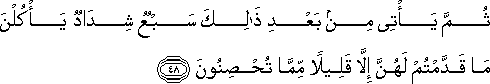 | 12.48 | Then after that will come seven hard years which will devour all that ye have prepared for them, save a little of that which ye have stored. | Thumma Ya'tī Min Ba`di Dhālika Sab`un Shidādun Ya'kulna Mā Qaddamtum Lahunna 'Illā Qalīlāan Mimmā Tuĥşinūna |