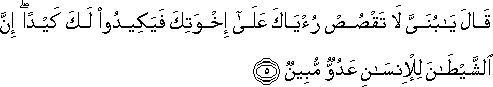| 12.5 | He said: O my dear son! Tell not thy brethren of thy vision, lest they plot a plot against thee. Lo! Satan is for man an open foe. | Qāla Yā Bunayya Lā Taqşuş Ru'uyā Ka `Alá 'Ikhwatika Fayakīdū Laka Kaydāan 'Inna Ash-Shayţāna Lil'insāni `Adūwun Mubīnun |