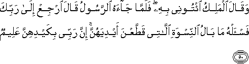 | 12.50 | And the king said: Bring him unto me. And when the messenger came unto him, he (Joseph) said: Return unto thy lord and ask him what was the case of the women who cut their hands. Lo! my Lord knoweth their guile. | Wa Qāla Al-Maliku A'tūnī Bihi Falammā Jā'ahu Ar-Rasūlu Qāla Arji` 'Ilá Rabbika Fās'alhu Mā Bālu An-Niswati Al-Lātī Qaţţa`na 'Aydiyahunna 'Inna Rabbī Bikaydihinna `Alīmun |
