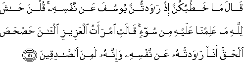 | 12.51 | He (the king) (then sent for those women and) said: What happened when ye asked an evil act of Joseph? They answered: Allah Blameless! We know no evil of him. Said the wife of the ruler: Now the truth is out. I asked of him an evil act, and he is surely of the truthful. | Qāla Mā Khaţbukunna 'Idh Rāwadttunna Yūsufa `An Nafsihi Qulna Ĥāsha Lillāhi Mā `Alimnā `Alayhi Min Sū'in Qālati Amra'atu Al-`Azīzi Al-'Āna Ĥaşĥaşa Al-Ĥaqqu 'Anā Rāwadttuhu `An Nafsihi Wa 'Innahu Lamina Aş-Şādiqīna |