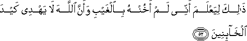| 12.52 | (Then Joseph said: I asked for) this, that he (my lord) may know that I betrayed him not in secret, and that surely Allah guideth not the snare of the betrayers. | Dhālika Liya`lama 'Annī Lam 'Akhunhu Bil-Ghaybi Wa 'Anna Allāha Lā Yahdī Kayda Al-Khā'inīna |