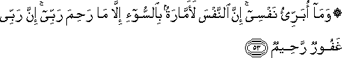 | 12.53 | I do not exculpate myself. Lo! the (human) soul enjoineth unto evil, save that whereon my Lord hath mercy. Lo! my Lord is Forgiving, Merciful. | Wa Mā 'Ubarri'u Nafsī 'Inna An-Nafsa La'ammāratun Bis-Sū'i 'Illā Mā Raĥima Rabbī 'Inna Rabbī Ghafūrun Raĥīmun |