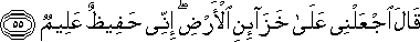 | 12.55 | He said: Set me over the storehouses of the land. Lo! I am a skilled custodian. | Qāla Aj`alnī `Alá Khazā'ini Al-'Arđi 'Innī Ĥafīun `Alīmun |