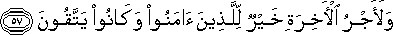 | 12.57 | And the reward of the Hereafter is better, for those who believe and ward off (evil). | Wa La'ajru Al-'Ākhirati Khayrun Lilladhīna 'Āmanū Wa Kānū Yattaqūna |