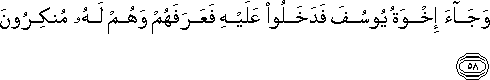 | 12.58 | And Josephīs brethren came and presented themselves before him, and he knew them but they knew him not. | Wa Jā'a 'Ikhwatu Yūsufa Fadakhalū `Alayhi Fa`arafahum Wa Hum Lahu Munkirūna |