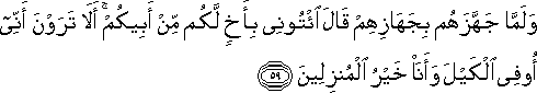 | 12.59 | And when he provided them with their provision he said: Bring unto me a brother of yours from your father. See ye not that I fill up the measure and I am the best of hosts? | Wa Lammā Jahhazahum Bijahāzihim Qāla A'tūnī Bi'akhin Lakum Min 'Abīkum 'Alā Tarawna 'Annī 'Ūfī Al-Kayla Wa 'Anā Khayru Al-Munzilīna |