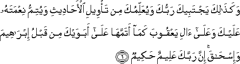 | 12.6 | Thus thy Lord will prefer thee and will teach thee the interpretation of events, and will perfect His grace upon thee and upon the family of Jacob as He perfected it upon thy forefathers, Abraham and Isaac. Lo! thy Lord is Knower, Wise. | Wa Kadhalika Yajtabīka Rabbuka Wa Yu`allimuka Min Ta'wīli Al-'Aĥādīthi Wa Yutimmu Ni`matahu `Alayka Wa `Alá 'Āli Ya`qūba Kamā 'Atammahā `Alá 'Abawayka Min Qablu 'Ibrāhīma Wa 'Isĥāqa 'Inna Rabbaka `Alīmun Ĥakīmun |