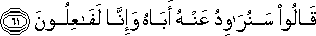 | 12.61 | They said: We will try to win him from his father: that we will surely do. | Qālū Sanurāwidu `Anhu 'Abāhu Wa 'Innā Lafā`ilūna |