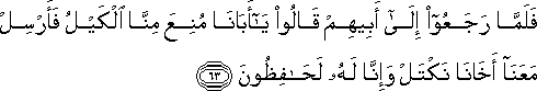| 12.63 | So when they went back to their father they said: O our father! The measure is denied us, so send with us our brother that we may obtain the measure, surely we will guard him well. | Falammā Raja`ū 'Ilá 'Abīhim Qālū Yā 'Abānā Muni`a Minnā Al-Kaylu Fa'arsil Ma`anā 'Akhānā Naktal Wa 'Innā Lahu Laĥāfiūna |
