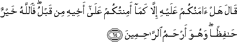 | 12.64 | He said: Can I entrust him to you save as I entrusted his brother to you aforetime? Allah is better at guarding, and He is the Most Merciful of those who show mercy. | Qāla Hal 'Āmanukum `Alayhi 'Illā Kamā 'Amintukum `Alá 'Akhīhi Min Qablu Fa-Allāhu Khayrun Ĥāfiāan Wa Huwa 'Arĥamu Ar-Rāĥimīna |