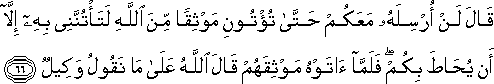 | 12.66 | He said: I will not send him with you till ye give me an undertaking in the name of Allah that ye will bring him back to me, unless ye are surrounded. And when they gave him their undertaking he said: Allah is the Warden over what we say. | Qāla Lan 'Ursilahu Ma`akum Ĥattá Tu'utūni Mawthiqāan Mina Allāhi Lata'tunanī Bihi 'Illā 'An Yuĥāţa Bikum Falammā 'Ātawhu Mawthiqahum Qāla Allāhu `Alá Mā Naqūlu Wa Kīlun |
